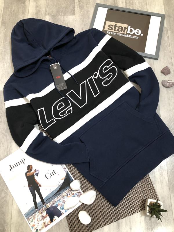 Худі від levi's, темно-синього кольору з фірмовим логотипом на грудях. Приємний до тіла, без начісування. Стандартний крій. Розмір на бірці - L Плечі - 50 Груди(пахви) - 60 Рукав - 65 Довжина - 71 Склад: 100% бавовна. З будь-яких питань пишіть!