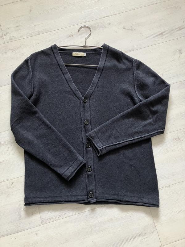 Вовняний кардіган темно синє-сірого кольору, на ґудзиках, застібка на чоловічу сторону, але на гарно виглядає і на жінці. Довжина 60, плечі 44, рукав 57, пог 49, низ 49. Дорогий італійський бренд WEBER+WEBER Sartorial