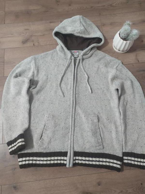 Затишок і стиль у кожній деталі. Теплий чоловічий кардиган-куртка Rainbow Collection із сірої меланжевої пряжі — комфорт, який пасує до всього. Кишені, капюшон і коричневі манжети додають практичності та характеру. Кардиган-куртка із капюшоном на блискавці із сірої пряжі меланж. Розмір XL. Заміри за запитом.