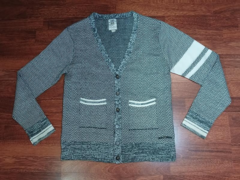Чоловічий кардиган Diesel, вінтажна модель, розмір M (йде на 48 розмір, дивись заміри нижче), склад: 50% шерсть, 30% віскоза, 20% нейлон, стан відмінний, на гудзиках (всі гудзики пробиті логотипом), під лівою кишенею металевий логотип на шкіряному ремінці, Ширина плечей - 46 см Ширина під пахвами - 54 см Довжина рукава – 65 см від плеча Довжина по спині – 64 см Ширина внизу – 47 см