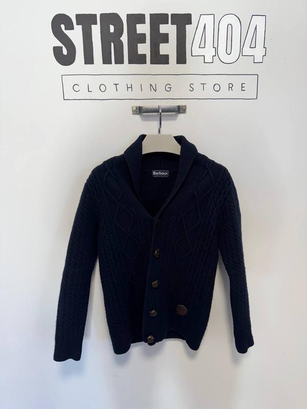 Класичний чоловічий в’язаний кардиган Barbour — теплий, комфортний та стильний вибір для холодного сезону. Виконаний у глибокому темно-синьому кольорі з традиційним візерунком “косичка”, що підкреслює фірмовий британський характер бренду. Особливості: • Оригінальний продукт Barbour (лого на шкіряній бірці). • Колір: Navy (темно-синій) • Розмір: M • Щільна в’язка з класичним ромбовим візерунком. • Комір-шалька (shawl collar) для додаткового тепла й комфорту. • Великі гудзики з шкіряними вставками — характерна деталь Barbour. • Теплий, м’який та приємний до тіла — підходить як для повсякденного носіння, так і для smart-casual стилю. Матеріал: • Натуральна вовна (Wool blend) • М’яка структура, добре тримає форму та забезпечує тепло. Заміри (виріб лежачи): • Ширина: 52 см • Довжина: 68 см • Рукав: 65 см