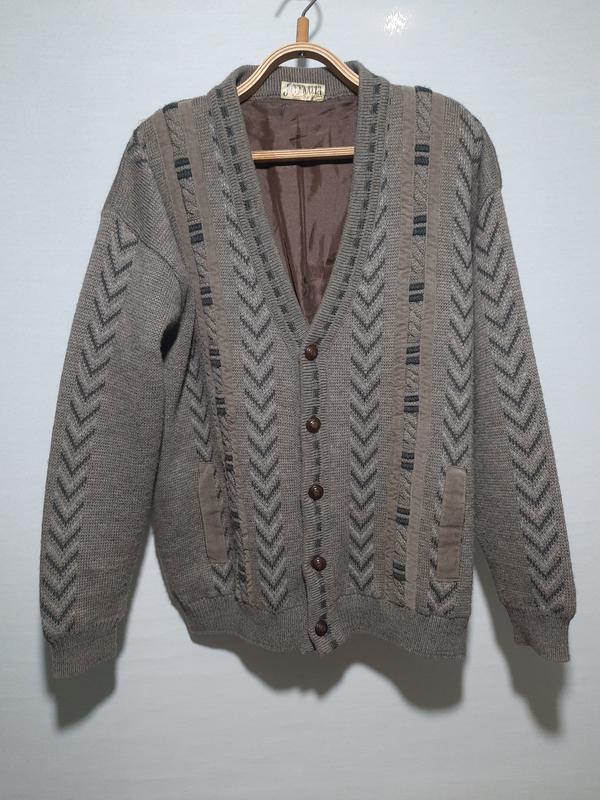 В'язаний класичний кардиган з мохером на підкладці вінтаж з геометричним принтом Об'ємний stefano ricci ,спущене плече kiton гудзики підшкіру ( пластик з металевим елементом) Оздоблено смужками під замшу zilli Є бічні кишені Колір сіро- коричневий( холодний відтінок ) Б/В в гарному стані Ширина грудей65 Ширина плечей 63 Плече 20 Довжина 72 Довжина рукава 60 Ширина рукава внизу 9 Ширина рукава де біцепс 20 Пройма27 Ширина внизу 48 Гудзики починаються на відстані від плеча35
