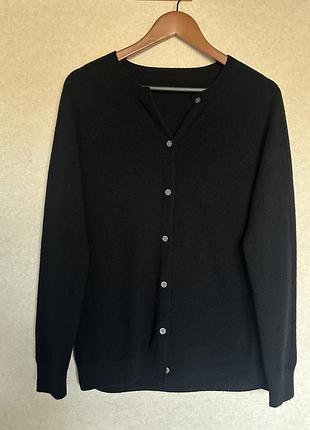 Класичний чорний кардиган із високоякісної вовни( дуже мякенька, приємна- по вигляду і тактильно нагадує кашемір). Швів не має ( кругова вʼязка) -характерно для дорогих брендів. Стан ідеальний, без нюансів.Розмір XXL( але краще буде на XL).