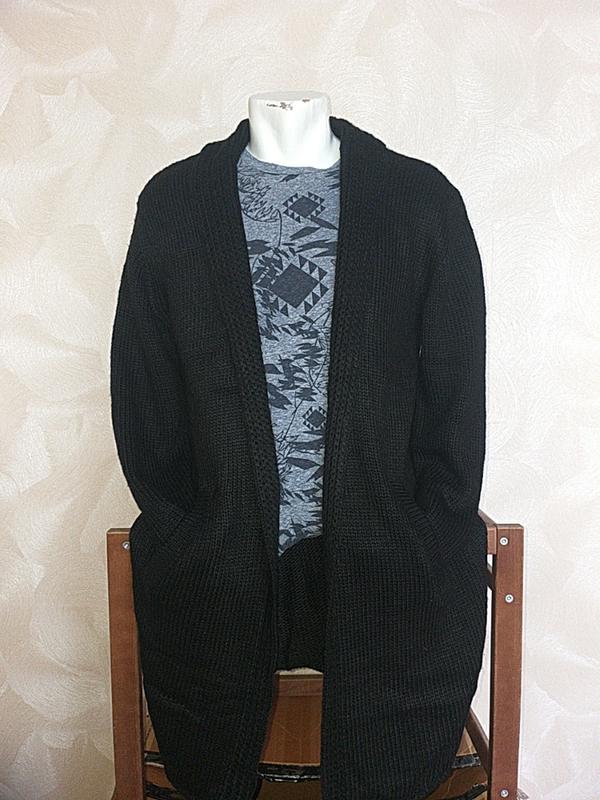 стильний теплий м'яка який продовжений кардиган чорного кольору, з кишенями, крупна в'язка , чудова якість, виробник Туреччина. Розмір L довжина 91см.