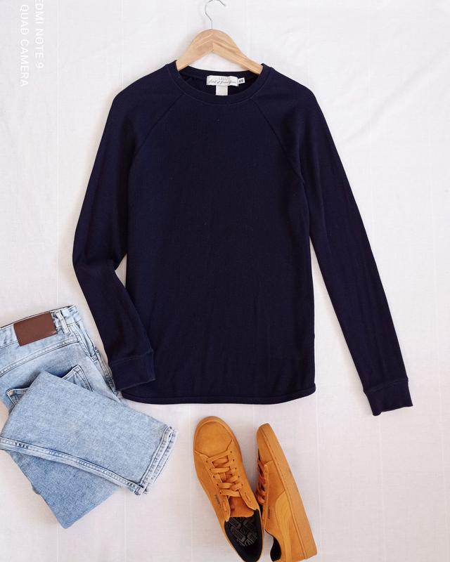 темно синій пуловер від H&M прямого крою, тканина 60% котон, 40% поліестр, добре тягнеться, розмір вказано М, З грудей 52 см, довжина 75 см