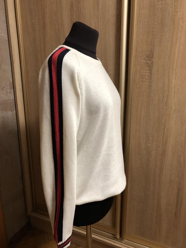 Светр білого кольору з смугами темно синього і червоного кольору. 50 % бавовна. Стан ідеальний. Італійський бренд. Унісекс Заміри Напівобъєм в грудях 53 Рукав 70 см Ширина знизу по резинці 46 Довжина 61