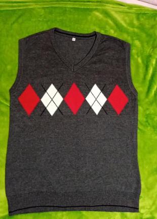 СТИЛЬНИЙ ЖИЛЕТ В'ЯЗАНИЙ СІРОГО КОЛЬОРУ З РОМБАМИ. ЗАМІРИ ДОВЖИНА 65. ПЛЕЧІ 43. НА ГРУДЯХ 48-49. НИЗ ГУМА -46-47 СМ