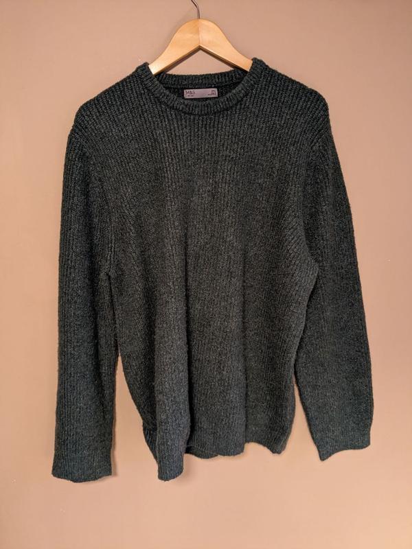 Теплий светр темно-зеленого кольору - камера не передає колір справжній. Зручний, теплий, приємний до тіла. Розмір: 2XL. Дефектів немає. Матеріал: 67акрил, 33поліамід.
