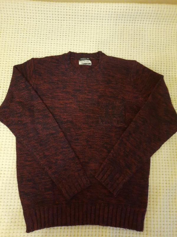 Красивый свитер, мужской или подростковый, нитка акрил меланж бордо с синим. Слева нагрудный карманчик, декор, вязка косичка.
