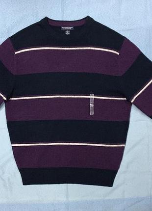Джемпер мужской американского бренда Roundtree & Yorke, в сине-фиолетовом цвете в белую полоску, производство Китай, материал (мягкий, толстый, стрейчевый) - 40% хлопок, 35% полиэстер, 25% шерсть! Очень теплый! Размер: L : ПОГ - 57 см, длина ( перед ) - 65 см, длина ( спина) - 71 см, рукав - 65 см, плечи - 51 см. Размеры длины данные от края горловины, рукава - от шва плеча, плечи - расстояние между швами плеча.