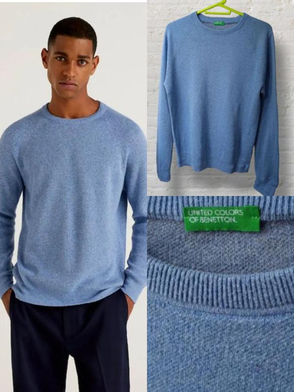 Якісний светрик. приємний до тіла. Підійде як чоловікам. так і жінкам. Нитка товста, тримає форму, фактурна резинка на рукавах та по низу виробу. Колір-блакитний, синій джинс. На моделях схожі светри від Benetton для прикладу. 85% коттон, 15 % вовна. М'якенький, тягнеться. Стан чудовий, без дефектів. Підійде на розміри М/46,S/44. Довжина по середині спинки-62см ширина, пахви-48см плече реглан з рукавом-76см. Відправлю після оплати на картку.