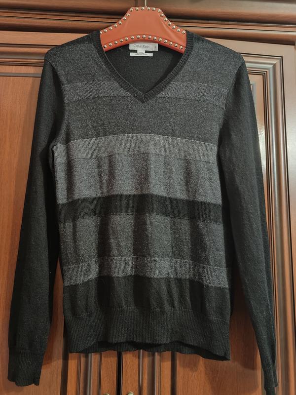 CALVIN KLEIN Мужской свитер с V-образным вырезом размер S .Черный полосатый,100% мериносовая шерсть.Длина 68см,Плечи 42см,ПОГ 48см,длина рукава 68см.