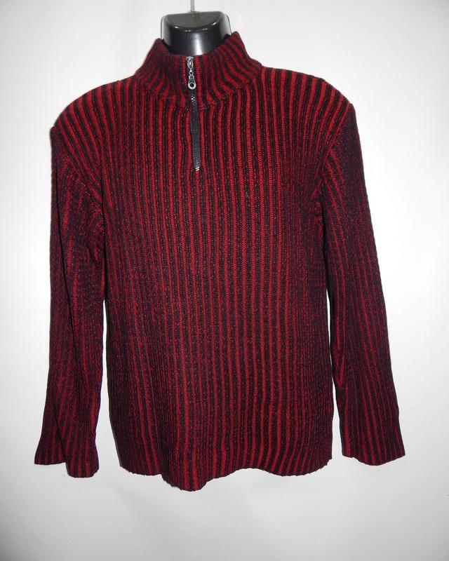 Светр чоловічий Mudo р.48-50 087SM Красивий стильний светр, у смужку, відмінна якість. Вінтажному стилі. Пошиття прямої. Середня товщина. Овальний виріз горловини. Комір - стійка, що застібається на блискавку. Тканина светр: 30% шерсть, 70% акрил. Добре лягає по фігурі, добре тягнеться. Прохання, звіряти мірки зі своїми мірками перед покупкою. Стан б/в - добрий. Дір, плям, запаху - ні. Мірки по верху светра: плечі - 50 см, напівоб'єм грудей - 56 см, напівоб'єм талії - 53 см, довжина рукава - 63 см, довжина виробу - 69 см.