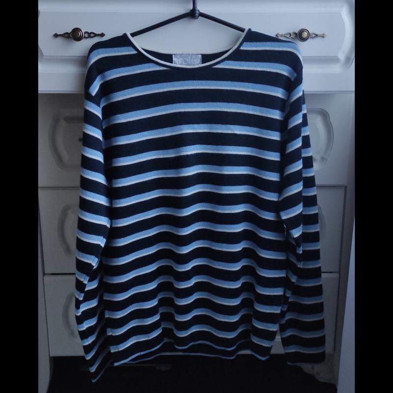 Чоловічий шерстяний светр українського виробництва у смужку в розмірі S/M. Прямого крою (без резинки знизу), у відмінному стані. Склад: 50% шерсть, 50% акрил. Заміри: довжина 67 см, ширина плечей 43 см, довжина рукава 66 см, напів об'єм грудей 54 см. Пересилаю Новою поштою і Укрпоштою в тому числі і через безпечну оплату.
