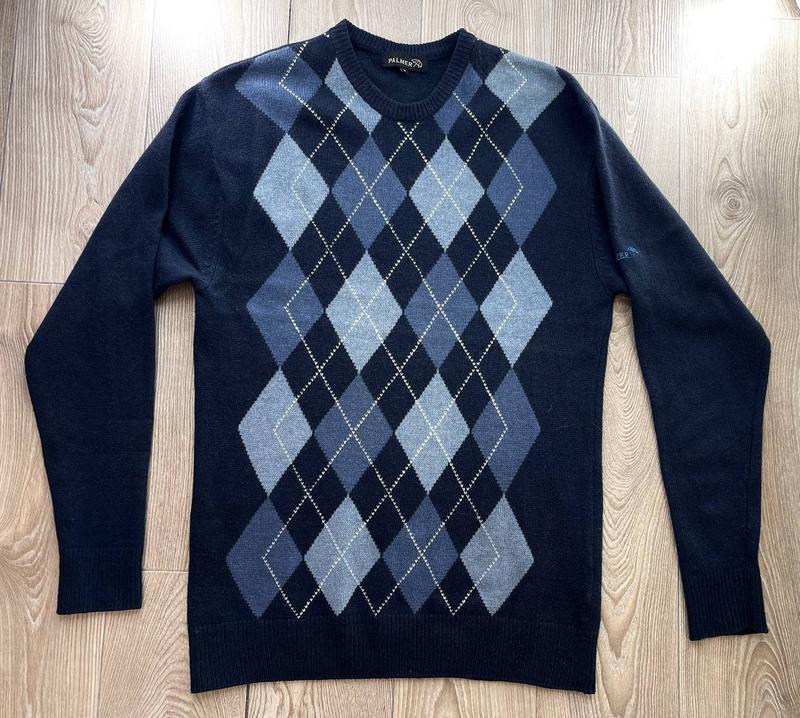 Светр вовняний чоловічий темно-синього кольору з ромбами PALMER🛍️❤️🔥 Розмір - UK 10-12/ EUR 38-40/ M-L/ 48-50. Склад : 80% вовна, 20% нейлон. Виробник Китай. Светр з вовни середньої товщини, спереду з ромбами в блакитних відтінках. Круглий виріз горловини з неширокою резинкою. На одному рукаві логотип-вишивка бренду. Додаткові заміри: повна довжина 78 см (з них висота резинки 7 см, ширина плечей 54 см, довжина рукава 67 см (з них висота резинки 7 см), напівобхват грудей 54 см (повний обхват 108 см) і тягнеться до 140 см, напівобхват талії 50 см (повний обхват 100 см) і тягнеться до 130 см, напівобхват резинки внизу 50 см (повний обхват 100 см) і тягнеться до 140 см.