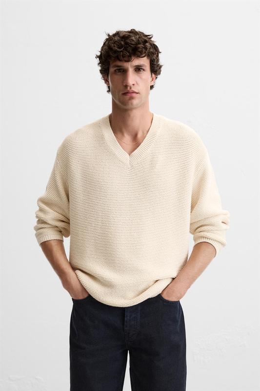 Светр вільного крою з бавовни. V-подібний виріз, довгі рукави. Деталі в рубчик.