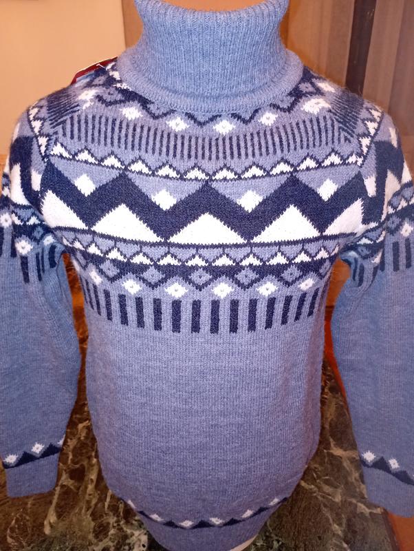 Светр зимовий. Унісекс. Високе подвійне горло. Орнамент. Рукав реглан. Дуже м'який та теплий. Вовна 70% Акріл 30% Розміри в сантиметрах: груди 48 довжина 65 довжина рукава від горловини 67