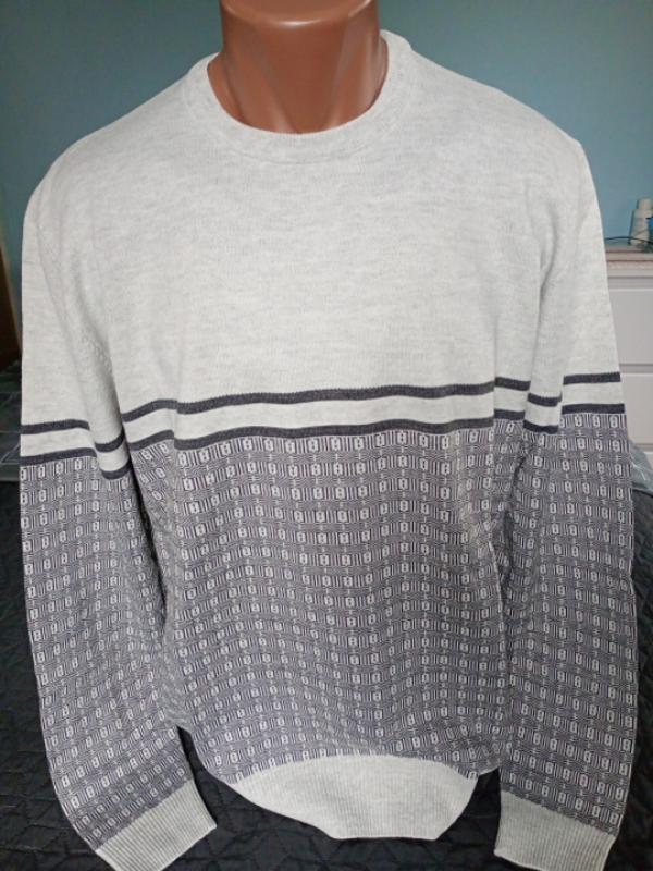 Светр чоловічий світло сірого кольору з контрастним орнаментом. Батальної серії в наявності три розміри. 2XL груди 59 довжина 74 довжина рукава від горл. 84 3XL груди 60 довжина 75 довжина рукава від горл. 85 4XL груди 63 довжина 76 довжина рукава від горл. 86 склад: 60%вовна 30%акрил 10% поліамід Дуже гарної якості. виробник DOLFIN Турція