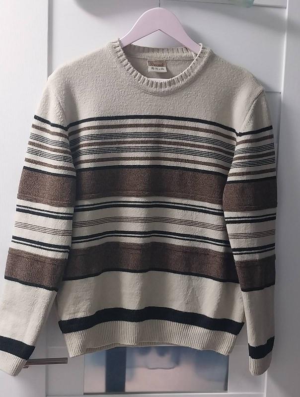 Светр теплий, склад:50%-вовна, 50%-акрил, колір бежевий ,смужки чорні та коричневі. Заміри: плечі 48 см, грудна -56 см, довжина рукава 65 см, довжина по спині -67 см.