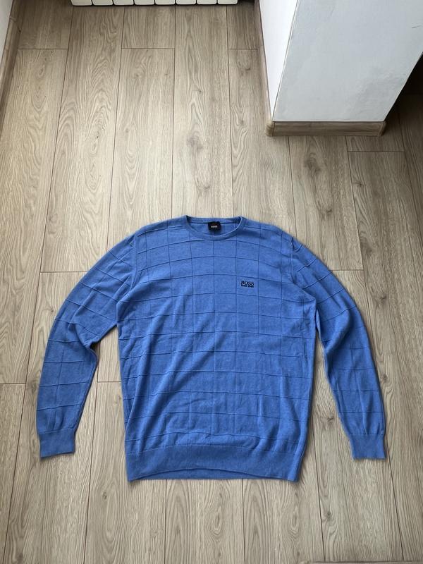 Пропоную вашій увазі фірмовий джемпер від преміального бренду BOSS. Модель вирізняється благородним блакитним кольором та унікальною об'ємною фактурою у вигляді великої клітинки, що виглядає дуже стильно та сучасно. Розмір: XL В чудовому стані Плечі:49 см Полу обхват грудей:61 см Довжина по спині:76 см Довжина рукава від пахви:50 см