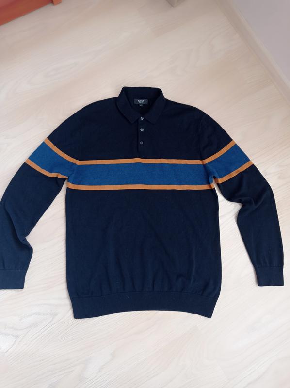 Красивий чоловічий светр темно-синього кольору. Бренд– «NEXT». Розмір пише XL, підійде і на L (для точності внизу див. заміри). Заміри: 1.Ширина в плечах –48 см. 2. Ширина по спині ( від пахви до пахви )- 57 см. 3. Довжина рукава по зовнішньому шву - 70 см. 4. Довжина рукава по внутр.шву - 50 см. 5.Загальна довжина кофти – 75 см. Склад:100% - бавовна. Матеріал тонкий та легкий, приємний до тіла.