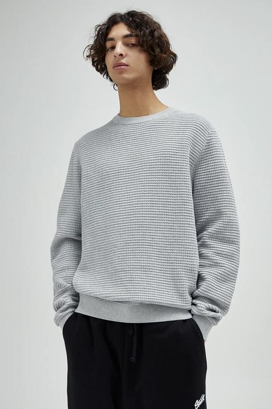 Свитер с вафельной текстурой, круглым воротником, длинными рукавами и окантовкой в рубчик. Изготовлен из 100% -го хлопка.