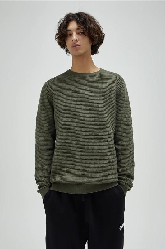Свитер с вафельной текстурой, круглым воротником, длинными рукавами и окантовкой в рубчик. Изготовлен из 100% -го хлопка.