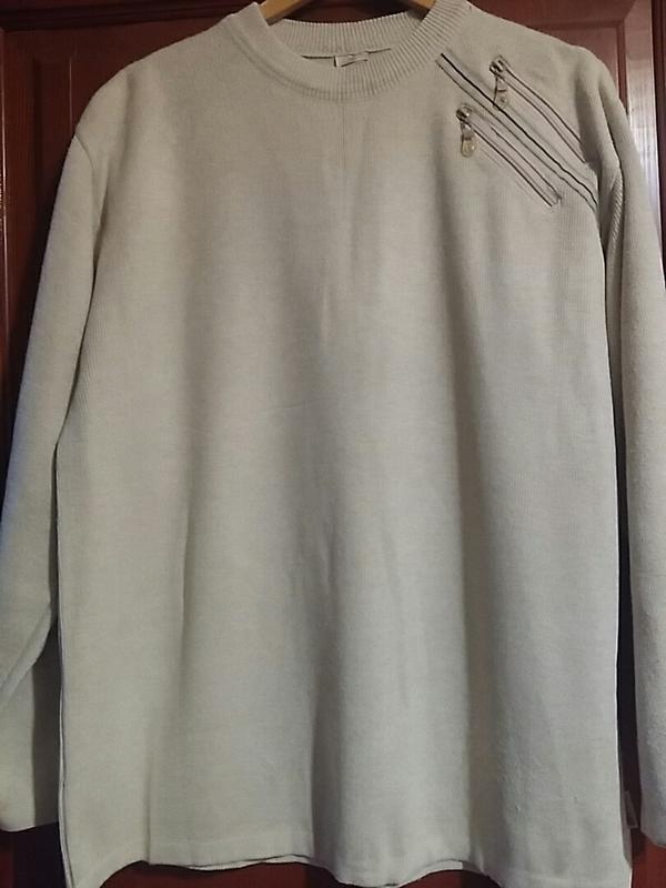 Светр. ALLAMEN. Розмір на бірці XXL. Дві декоративні блискавки на плечі. Колір: бежево-сірий. Ширина на рівні пахв 62 см. Ширина внизу 59 см Довжина рукава від плечового шва 60 см. Ширина на спині між плечовими швами 54 см Довжина по середині спини 72.5 див.