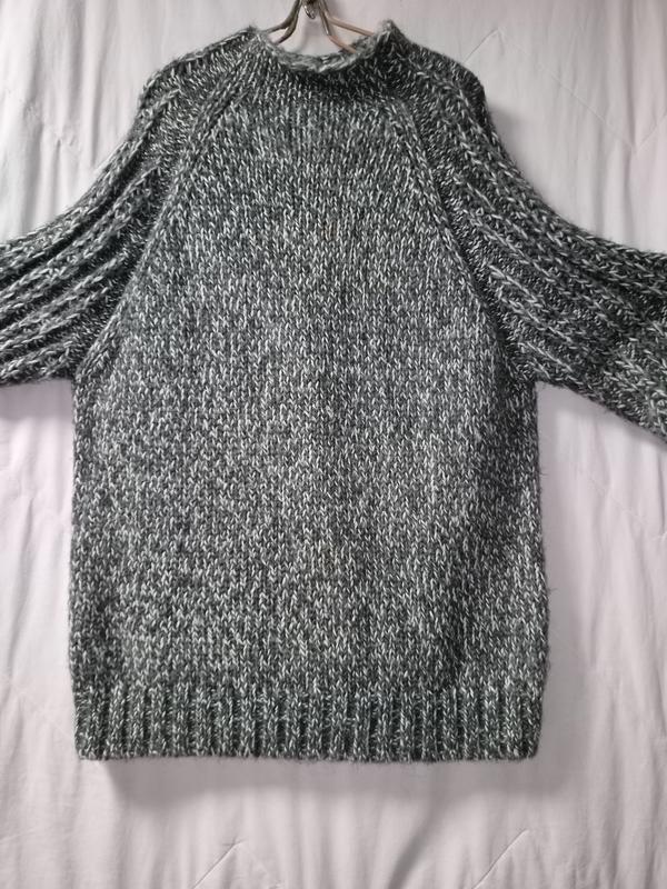 М'яка тепла меланжева шерсть,не колеться. В'язка пухка,відповідно відмінно тягнеться(підійде на кілька розмірів). Склад відмінний-42% вовна,28% альпака,30% акрил. Растягиваясь не обтягивает фигуру, так как нитка мягкая и толстая. ПОГ-60-75см ПОБ-58-78см, манжет вязка резинкой. Дл- 71см Рукав -от горловины 88см,реглан Шир.пл-44-52см ПО проймы-36см, ПО по бицепсу-22-39