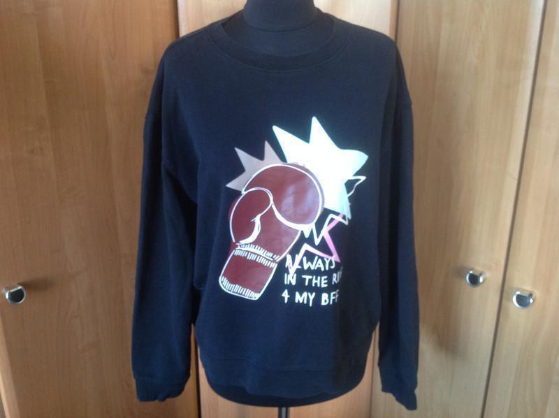 Толстовка, світшот чорний з принтом р. М модель оверсайз ширина по спинці під проймами 63 см довжина по спинці 60 см 100% бавовна