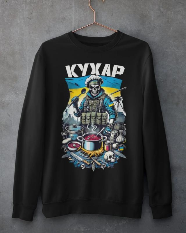 Теплий чорний світшот з унікальним принтом 'Кухар', що поєднує військову тематику з почуттям гумору. На спині зображений кухар у бронежилеті, який готує страви у польових умовах на фоні українського прапора. Яскравий і деталізований дизайн підкреслює патріотизм і додає характеру вашому стилю. Світшот виготовлений із якісного матеріалу, що забезпечує комфорт і тепло навіть у холодну погоду. Ідеальний вибір для патріотів, військових або як стильний подарунок для шанувальників незвичайного одягу. Доступно у різних розмірах.