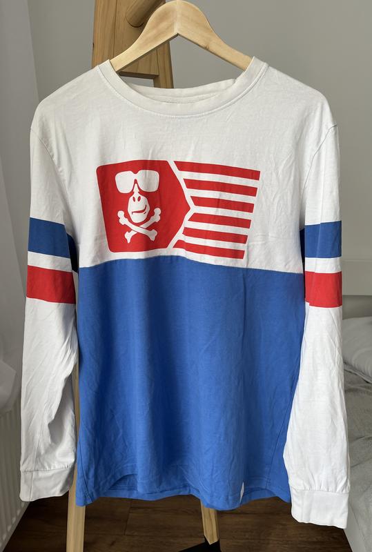 Світшот в нормальному стані, але є пляма на рукаві сзаду і жовтизна на вороті. Плечі - 47, пог - 58, довжина - 71, рукав - 65