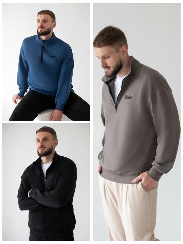 Мужской свитшот с длинным рукавом. Модель выполнена из мягкой и приятной на ощупь ткани, имеет прямой крой, эластичные манжеты и нижний пояс-резинку для удобства в носке. Особенностью является высокий воротник стойка с короткой застежкой-молнией спереди, что добавляет спортивный стиль и практичность. Стильный и универсальный вариант для повседневных образов, занятий спортом или отдыха. Полотно: футер двухниточный Состав: 80% хлопок, 17% полиэстер, 3% эластан Советы по уходу: стирать при температуре не более 30°C. Параметры модели: обхват груди 106, талия 95, бедра 106, рост 186 см. Размер одежды 52.
