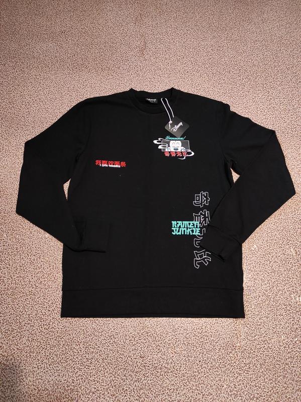 Світшот чорний з малюнком. Бавовна 100 %. Фліс. Плечі 49 см і 50 см ПОГ 57 і 59 див. див. Довжина 76 див. Рукав 73 див. ПО низу рукава 9 див. ПО низу свитшота 51 див.