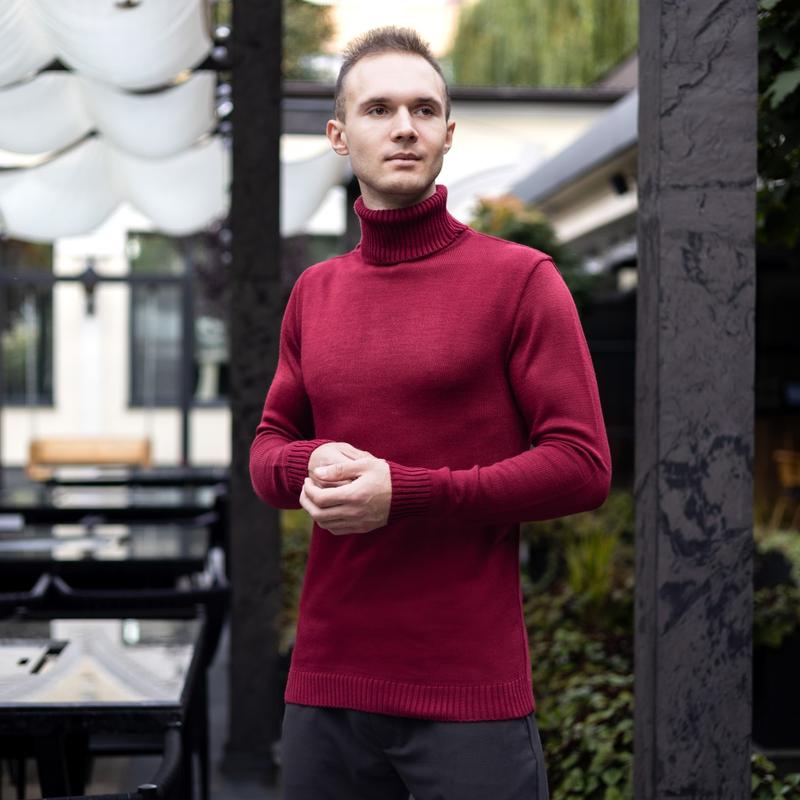 Светр під горло Pobedov "Axelrod" (Фсв00012) темно-червоний ▫️Відмінний чоловічий светр-гольф. ▫️ Матеріал: турецька пряжа 70% шерсть, 30% акрил ▫️Приталена модель. ▫️Має подвійну горловину, фасон - з відворотом, під горло. ▫️Дуже зручний, приємний до тіла. ▫️Зносостійкий і практичний - не кошлатиться при перших носіннях. ▫️Витриманий стиль, класичний крій і лаконічний дизайн светра не залишать ваш образ непоміченим, а приємний до тіла склад пряжі зігріє прохолодними вечорами.