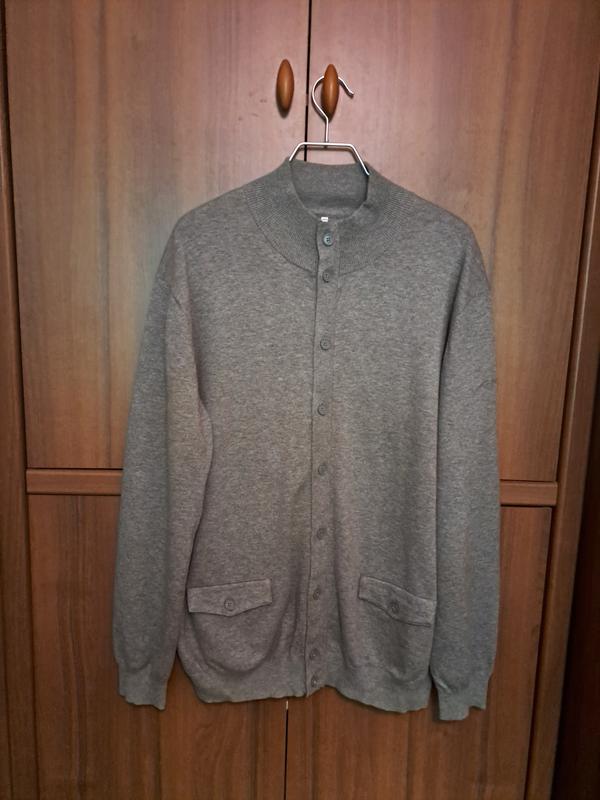 Чоловіча кофта темно- сірого кольору. Застібка на гудзики , стоячий комір еластичного в'язання захищає від вітру та холоду. Кишені з клапанами і гудзиками, на ліктя коричневі нашивки " під замшу ". Якісний трикотаж машинного в'язання, 76% котон, 19 % вовна, 5% еластан. Розмір від виробника- XXL. Пог. -62, довжина- 77, довжина рукава- 68 см. Бренд з репутацією провідного виробника чоловічого трикотажу.