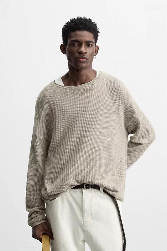 Легкий трикотажний светр вільного крою зі штапельної тканини з додаванням бавовни й 5 % льону. Круглий комір і довгі рукави.