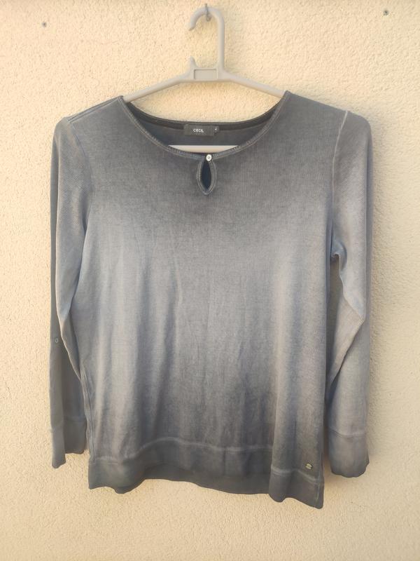 Лонгслів, кофта slim-fit унісекс, бренду Cecil, має фарбування з ефектом варіння, сірого кольору, можливість підібрати рукави на гудзик, дуже стильно виглядає, бірка зі складом зрізана. Склад: 95% котону, 5% еластану. Розмір: L (дивіться на заміри піде на XL). Стан нової речі.