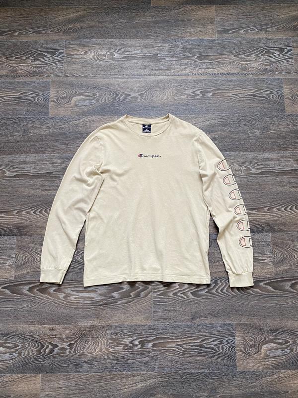 Оригінальний лонгслів Champion. Пісочний колір, логотип посередині та на рукаві. В ідеальному стані, як новий, але є декілька крапочок в районі плеча, потрібно відіпрати, на останньому фото видно. Розмір L: довжина 67 см, в грудях півобхват 55 см, плечі 45 см, рукав 65 см. Безпечна доставка / накладний платіж по мінімальній передоплаті 100 грн