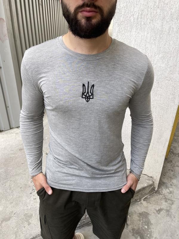 Лонгслів - футболка з довгим рукавом; - Матеріал: бавовна з додаванням еластану. Тканина легка, тактильно приємна, добре тягнеться. - Горловий виріз круглий. Силует приталений. - На грудях по центру вишитий Тризуб. - Сезон Весна/Осінь.