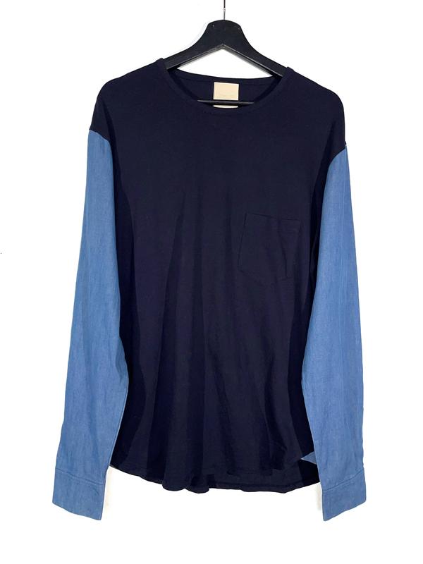 Розмір 50/М-Л Зроблено в Кореї Нетиповий лонгслів Темно-синій колір + Рукав від сорочки Знизу овальної форми На рукаві можна побачити ґудзик із маленьким брендом «Wooyoungmi» Дуже м'який і приємний до тіла Заміри: Довжина: 71 см Ширина: 53 см Рукав: 63 см Плечі: 49 см