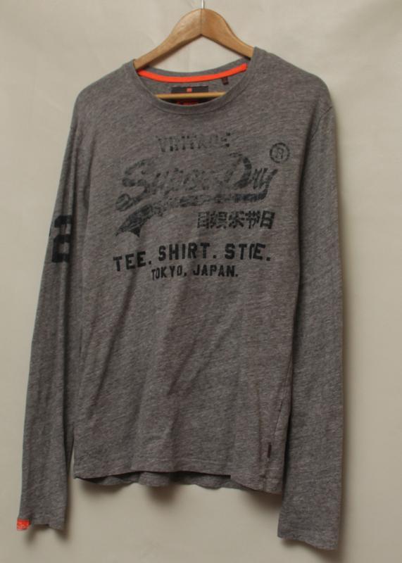 Меланжевий лонгслів із бавовни від Superdry. Декорований вінтажними принтами. Теб на підлогах і виході рукава. Плечі — 51 Пахви — 53 Довжина — 72 Рукав по-верху та по-низу — 68, 62