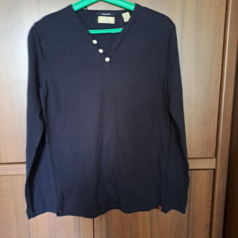 Черный лонгслив с акцентной деталью-имитацией застежки на три пуговицы контрастного цвета.(Есть запасная пуговица). Повседневный вариант одежды.Популярная молодежная фирма одежды. В составе 50% коттона и 50% акрила. Указан размер 16, но следует ориентироваться на замеры. Пог- 44, крой прямой, длина изделия- 50, длина рукава- 57-58.