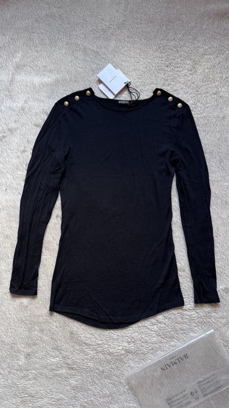 Balmain свитер, лонгслив. Оригинал. Новый. С бирками. Размер 40 Fr. Состав ткани: 70% шерсть, 30% шелк. Ткань мягчайшая. Трикотаж не толстый, не слишком плотный, а скорее средний, совсем чуть-чуть просвечивает. Ткань тянется, но при этом не растягивается, не теряет форму. Низ полукругом. Фурнитура ( пуговицы) золотого цвета. В комплекте идет запасная пуговица. Сделано во Франции. Стоил 422 $. Покупался на Farfetch.