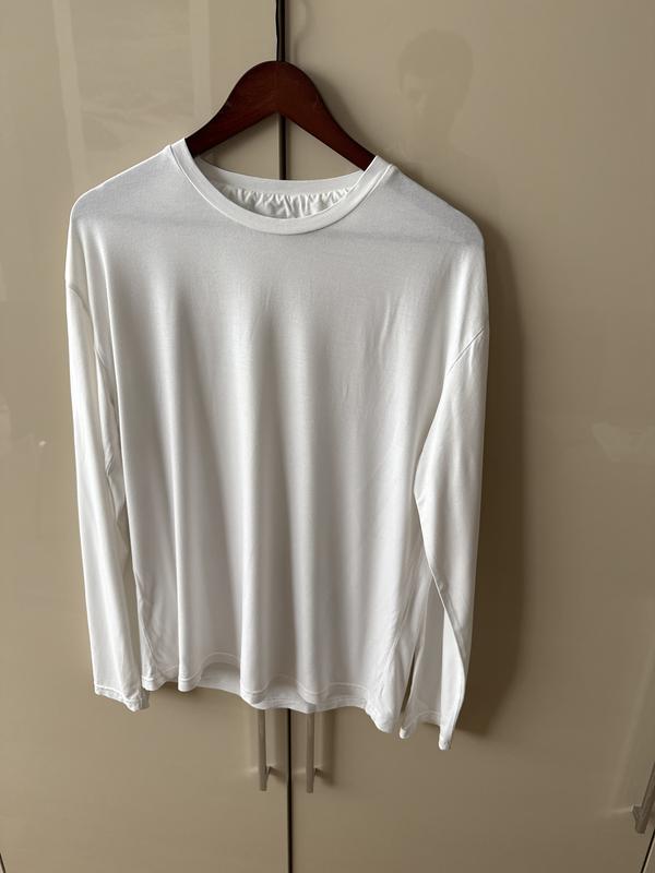 Лонг з круглим коміром і довгими рукавами, з мʼякої віскози. Одягався декілька разів. Без недоліків. Заміри не даю так як цей виріб підійде від S-M. Склад: Віскоза 95%, Еластан 5%