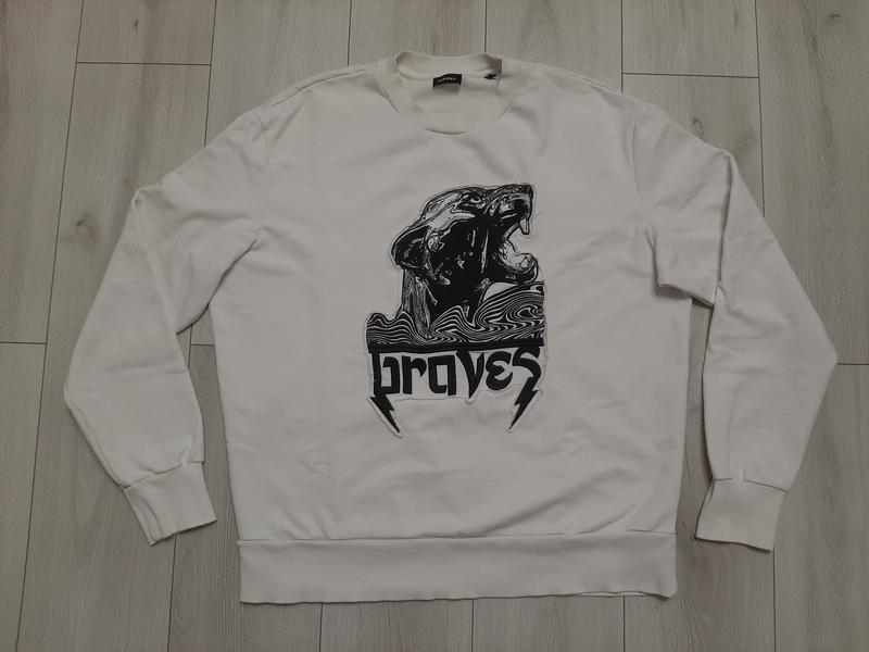 Diesel L braves крутий фірмовий чоловічий лонгслів білого кольору, розмір навіть на XL модель дозволяє, є маленька плямка не випралась на фото видно , нашивка кицьки вишита , заміри на фото .