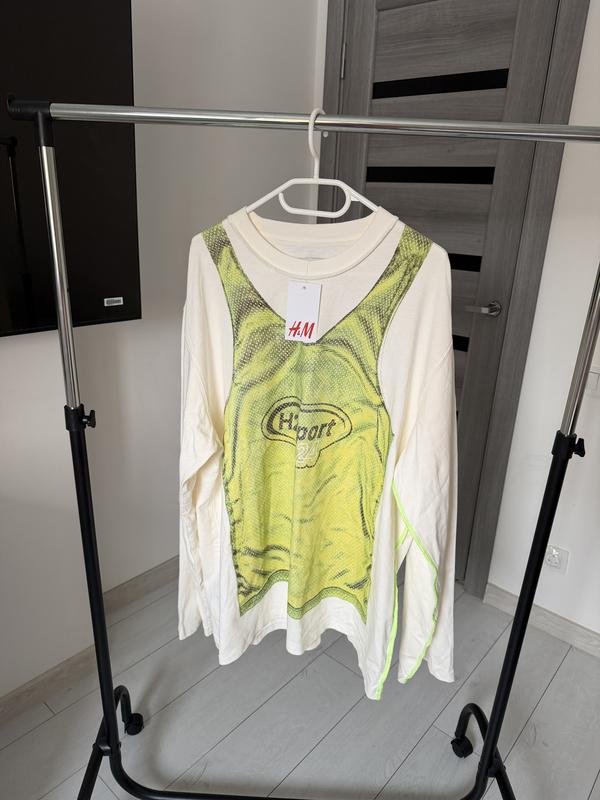 Колаборація H&M Heron Preston Топ із важкого бавовняного трикотажу з принтом спереду. Збільшений крій для мішкуватого надзвичайно вільного силуету. Круглий виріз горловини з ребрами, спущені плечі та довгі рукави. Шов контрастного кольору з одного боку та прямий зріз подолу. Розмір: М Заміри Плечі - 55см Груди напівобхват - 65см Рукав від плеча- 67см Довжина - 76см