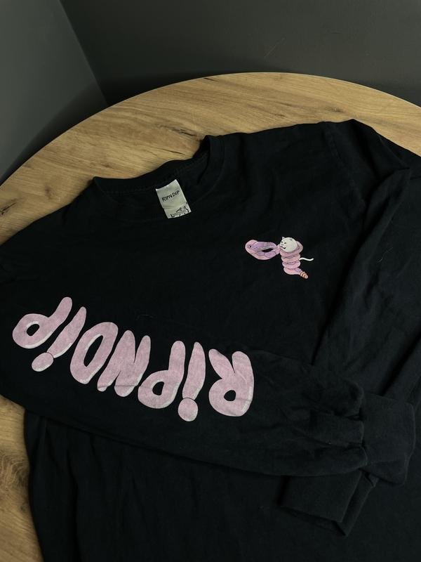 Оригінальний лонгслів RIPNDIP з яскравим фірмовим принтом на спині та рукавах. Виконаний зі щільної 100% бавовни, приємний до тіла. Класичний стрітстайл крій, еластичні манжети. Стан ідеальний, принт без тріщин. Розмір: S-M