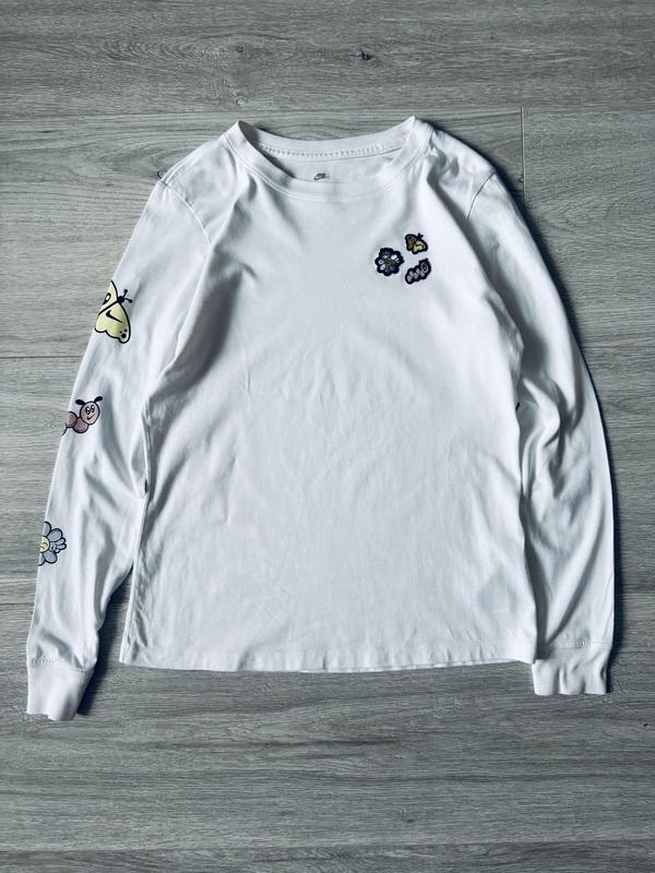 Білий лонгслів Nike The Nike Tee з яскравими принтами на рукавах і грудях. Особливості: • Оригінальна модель Nike • Білий колір з різнокольоровими принтами • Довгі рукави • М'яка бавовняна тканина • Круглий виріз • Стан: ідеальний Принти включають веселі мультяшні зображення, що додають стилю повсякденному образу. Підходить для casual-носіння та активного відпочинку.