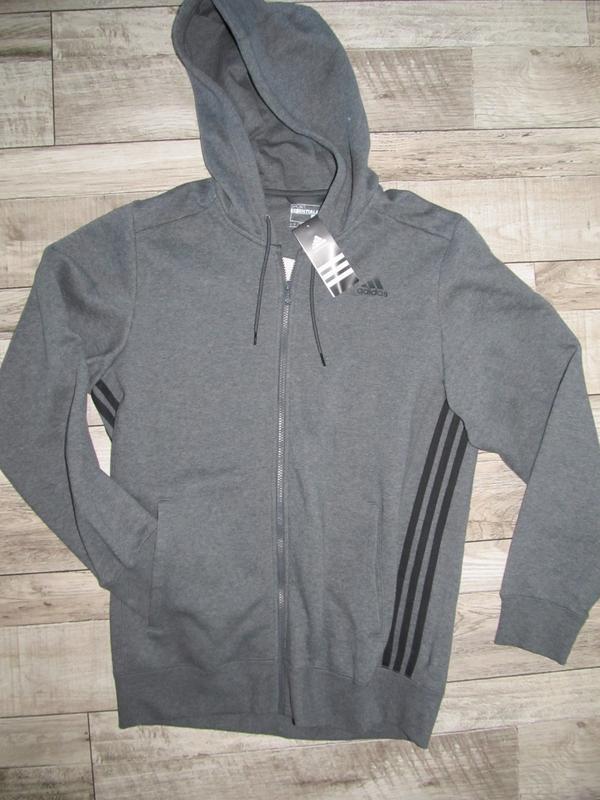 Оригінальна толстовка зі змійкою Adidas p. L 104-109 см Оригінал. Високоякісний щільний трикотаж, склад 70 % коттон,30% поліестер, гарний сірий колір, чорна бренд оздоблення Функціональний крій. Заміри : довжина по спинці-79 см, пог-62cm , по низу-53см, рукав -67см. плечі-48см. Нова. Ціна - 1500грн